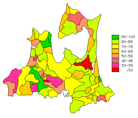 青森県 72.6%、最低 26.4%(東北町)、最高 100%(百石町・平舘村)、全国 81.4%